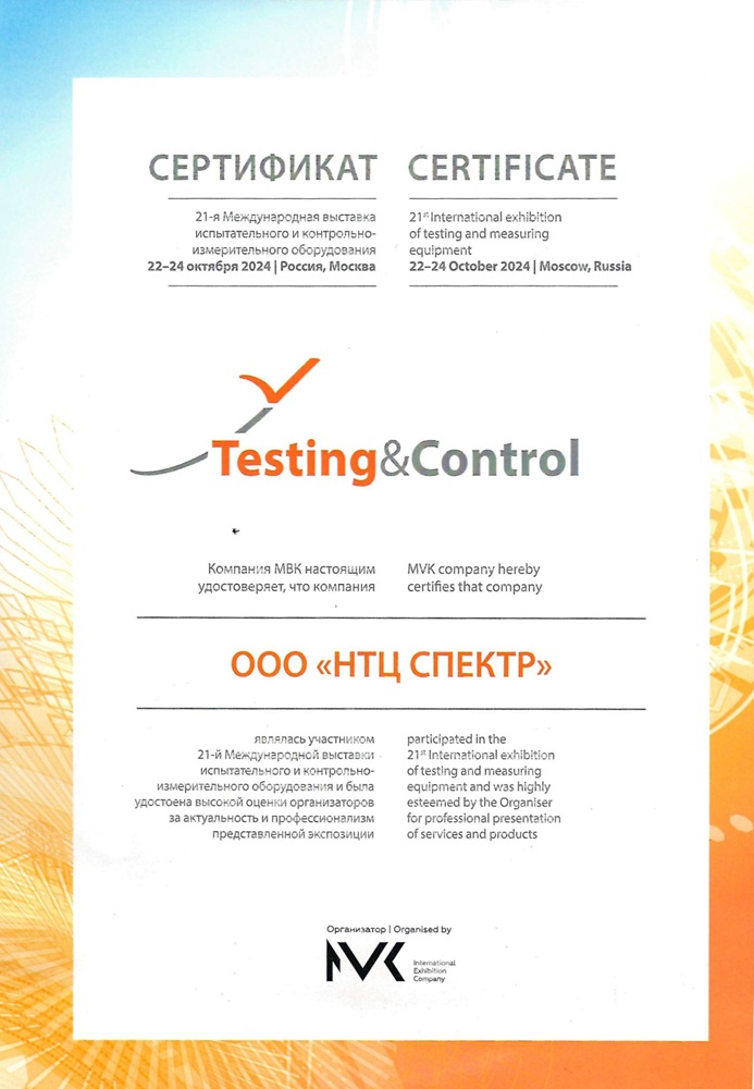 Сертификат участника выставки Testing&Contrlo 2024